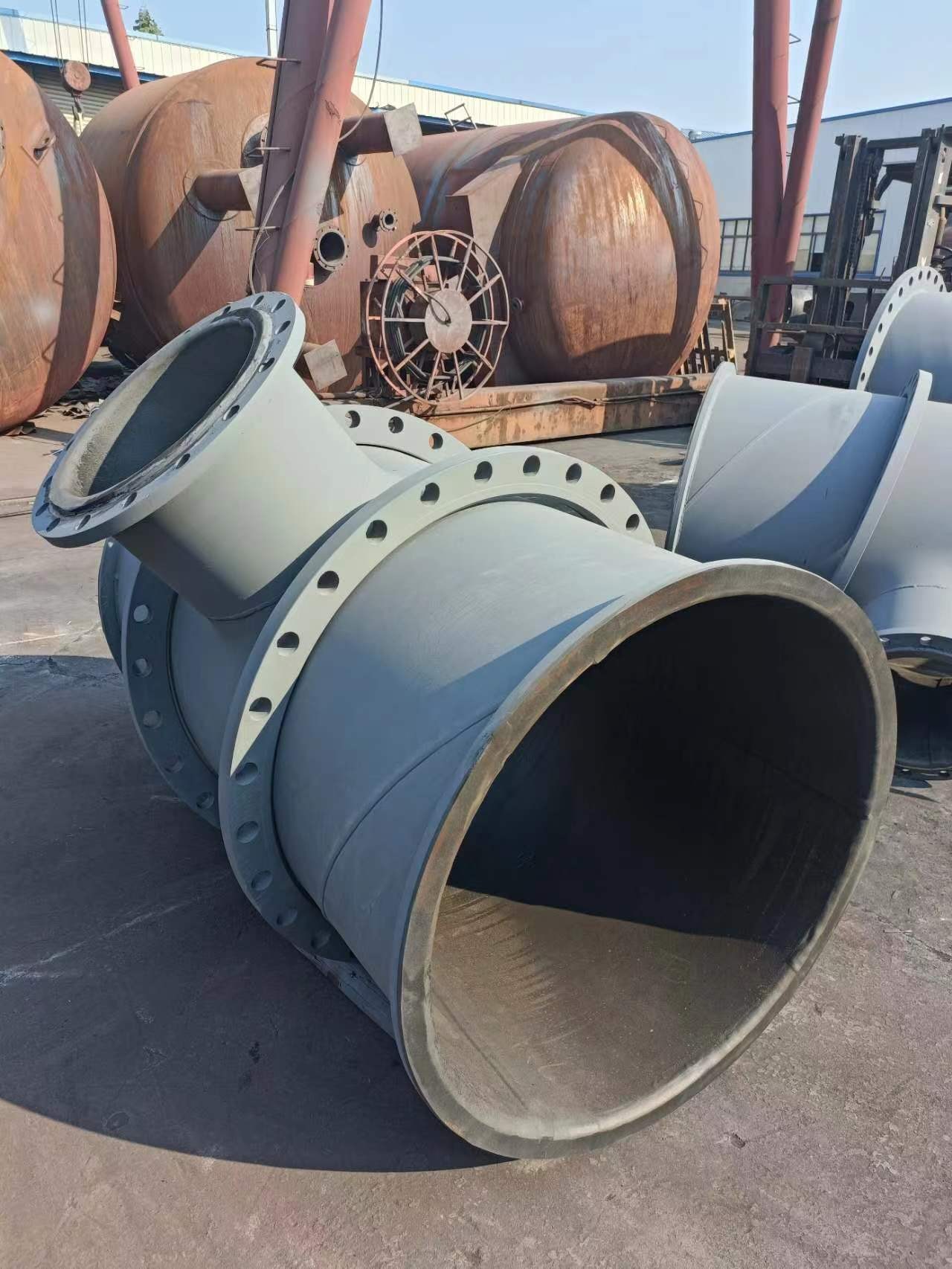 5.抗老化性能优越,在正常使用压力温度下一般使用寿命达到15年以上(理论值)。管道使用6-8年后近90°转动一次,使用寿命会更长,衬胶管道可反复衬胶使用4次,降低成本,制作周期短,可确保工期。